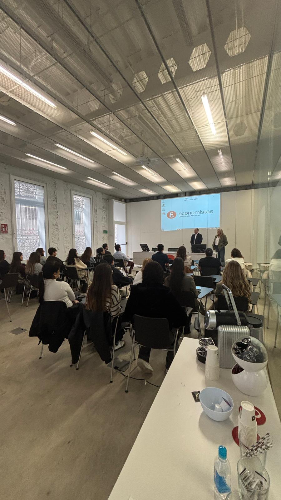 El lunes, 17 de noviembre, un grupo de estudiantes de la Facultad de Ciencias Sociales y Jurídicas de Elche participó en una jornada formativa organizada por el Colegio de Economistas de Alicante, con la colaboración del Banco de España. La actividad permitió al estudiantado conocer de primera mano el funcionamiento de estas instituciones y explorar diversas salidas profesionales en el ámbito económico y financiero.